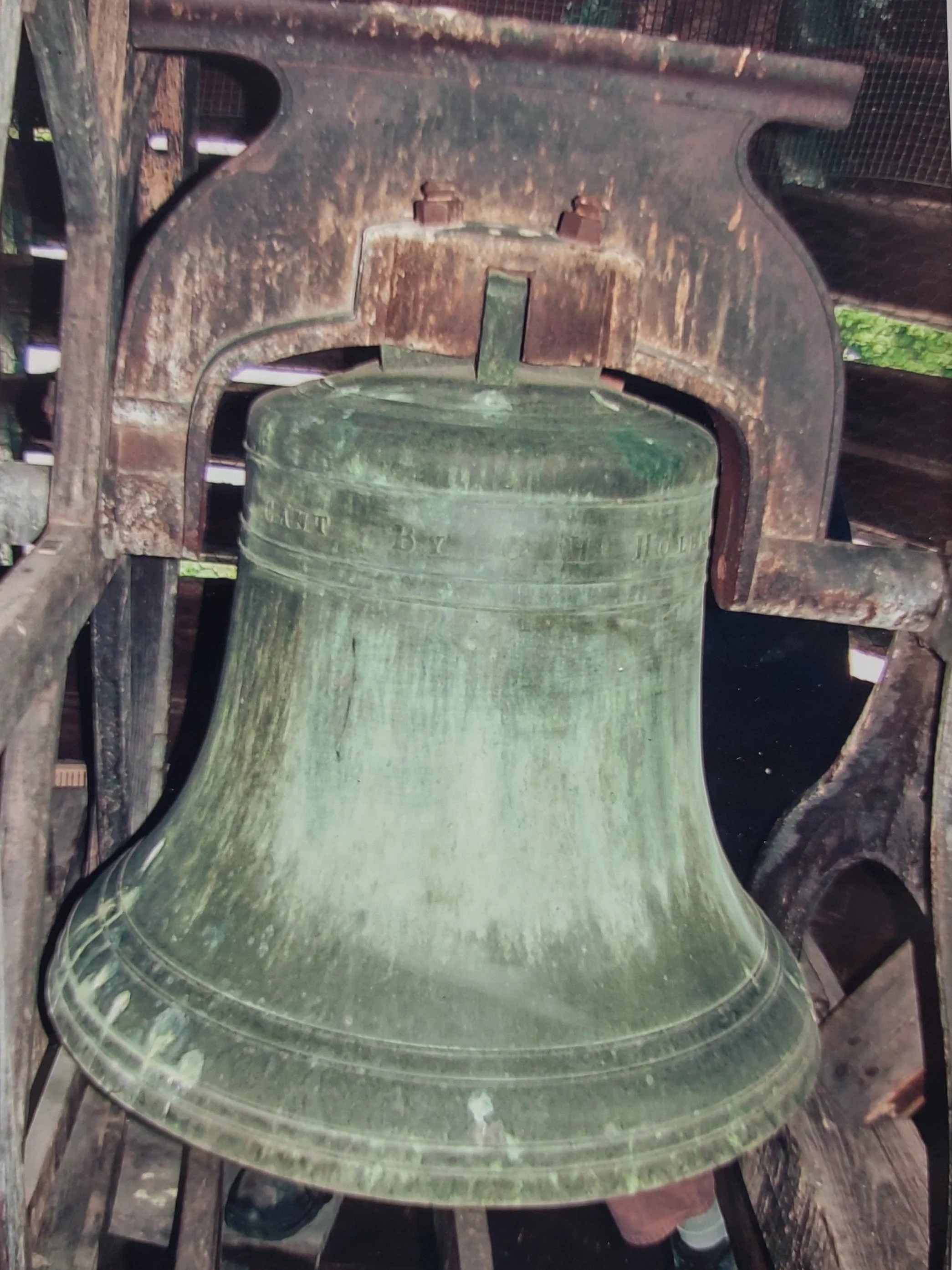 “I pulled the rope up from downstairs, put it back in place over the wheel and pulled. The bell swung very easily. Boy was I proud. I did not swing the yoke hard enough to ring the bell, but reached inside the bell, took hold of the clapper, swung it and hit the side of the bell. WRONG! When sitting next to a bell of this size, one does not ring the bell unless one has some kind of hearing protection. It was LOUD and clear.” Jim estimates that the bell weighs 1,000 pounds or more, is 3 ½ feet tall and is 2 feet across, and made of bronze.