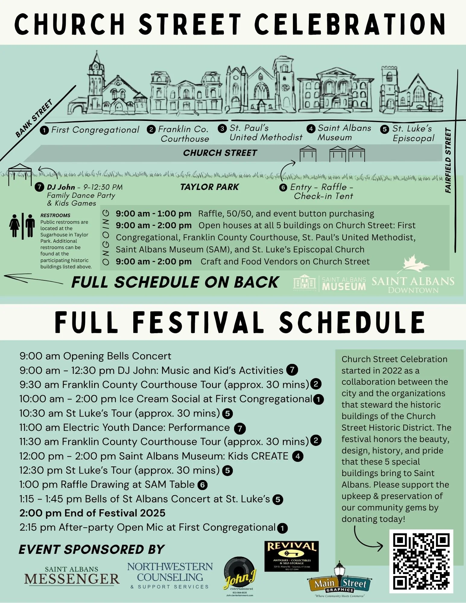 On Saturday July 26th visit downtown Saint Albans for a street-long celebration of the Church Street Historic District! From 9 am to 2 pm, visit the historic buildings on Taylor Park for tours and open houses. Be sure to get your raffle ticket and experience food trucks, craft vendors, kids games, animals, face painting, a family-friendly DJ, and a concert of the bells! This event is co-presented by First Congregational Church, Franklin County Courthouse, St. Paul’s United Methodist Church, Saint Albans Museum (SAM), St. Luke’s Episcopal Church, and The City of St Albans.